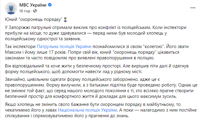 Если парень не изменит своего желания быть блюстителем порядка в будущем, то мы ждем его в рядах Национальной полиции Украины. А пока - наладим с ним постоянное общение", - рассказали в пресс-службе МВД.