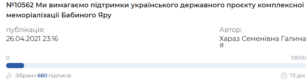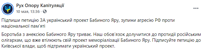 В конце апреля на сайте Киевсовета появилась петиция за государственный вариант комплекса. Ее сейчас усиленно продвигают связанные с Порошенко группы - например "Рух опору капітуляції", который требует предотвратить "российскую аннексию Бабьего Яра".