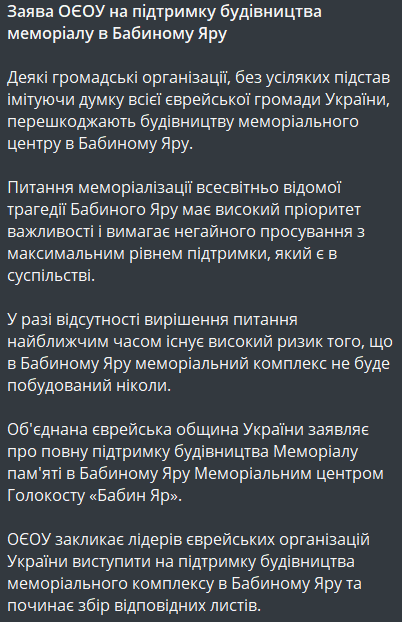 "Существует высокий риск того, что в Бабьем Яре мемориальный комплекс не будет построен никогда. Объединенная еврейская община Украины заявляет о полной поддержке строительства Мемориала памяти в Бабьем Яре Мемориальным центром Холокоста "Бабий Яр". ОЕОУ призывает лидеров еврейских организаций Украины выступить в поддержку строительства мемориального комплекса в Бабьем Яре и начинает сбор соответствующих писем", - заявляет объединенная община.