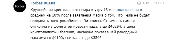 После заявление Илона Маска крупнейшие криптовалюты мира к утру четверга, 13 мая, подешевели в среднем на 10%. Биткоин, цена которого в начале мая только за сутки выросла на 55%, дешевел до 46 294 за единицу, а цена криптовалюты Ethereum, накануне показавшей рекордный максимум в $4 100, снижалась до $3 546.