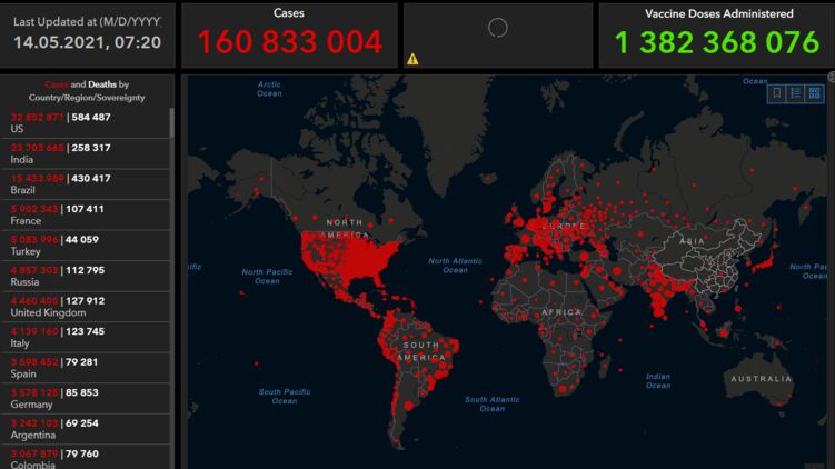 По состоянию на утро 14 мая, число зараженных на планете скоро превысит отметку в 161 миллион, фото: arcgis.com