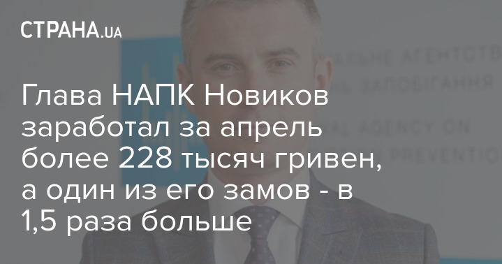 Председателя Национального агентства по предотвращению коррупции (НАПК) Александр Новиков, находящийся на этой должности с января прошлого года, заработал за апрель 228 тысяч гривен. Зарплата одного из его заместителей Ивана Преснякова оказалась в 1,5 больше.