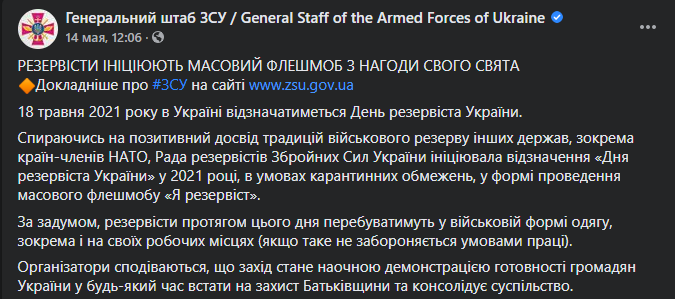 "Опираясь на положительный опыт традиций военного резерва других государств, в частности стран-членов НАТО, Совет резервистов Вооруженных Сил Украины инициировала празднования "Дня резервиста Украины" в 2021 году, в условиях карантина, в форме проведения массового флешмоба "Я резервист". По замыслу, резервисты в течение этого дня будут находиться в военной форме одежды, в том числе и на своих рабочих местах (если не возбраняется условиями труда). Организаторы надеются, что мероприятие станет наглядной демонстрацией готовности граждан Украины в любое время встать на защиту Родины и консолидирует общество", - говорится в сообщении Генштаба ВСУ