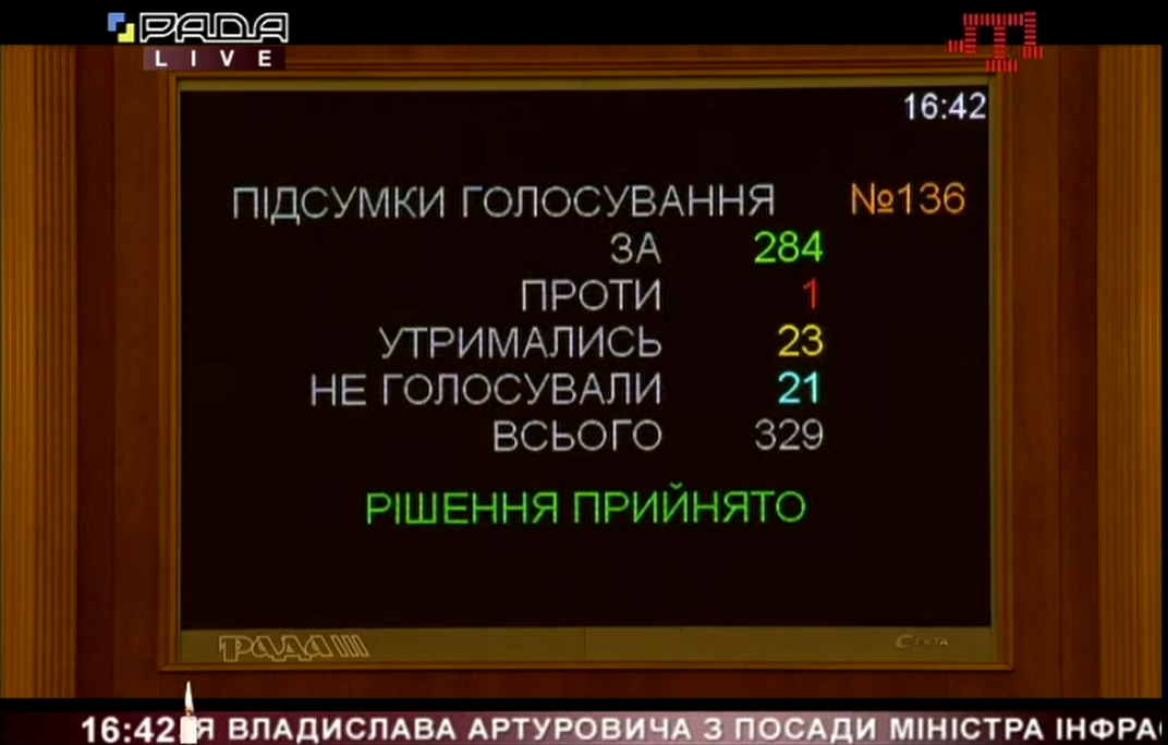 За отставку Владислава Криклия проголосовали 284 депутата, решение принято.