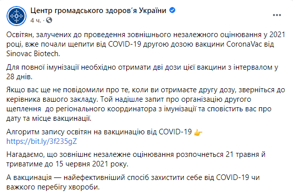 Представители Минздрава заявили, что педагогов, которые привлечены к проведению внешнего независимого оценивания в 2021 году, начали прививать второй дозой вакцины CoronaVac от Sinovac Biotech.