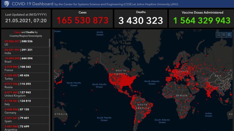 По состоянию на утро 21 мая, число зараженных на планете перевалило за 165 миллионов, фото: arcgis.com