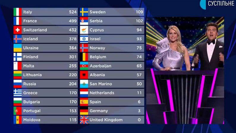 А вот зрители присудили Украине за песню "Шум" целых 267 баллов. Это и помогло украинской группе подняться в ТОП-5 с общим результатом 364 балла.
