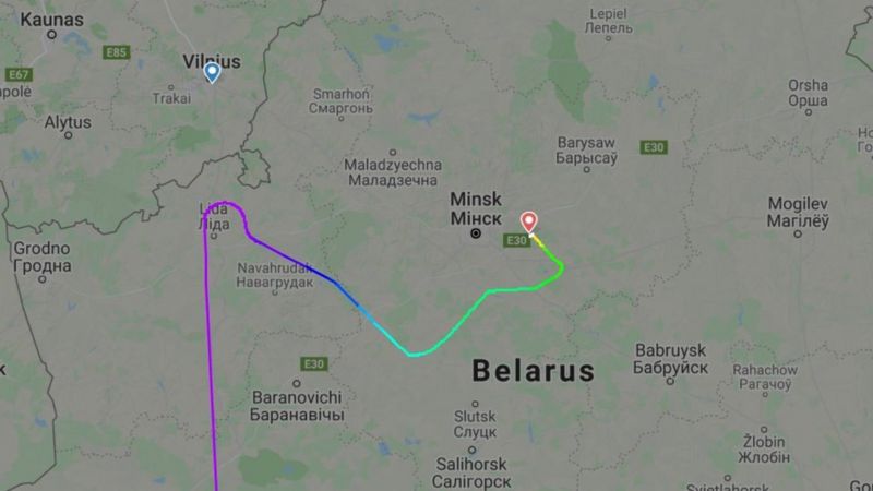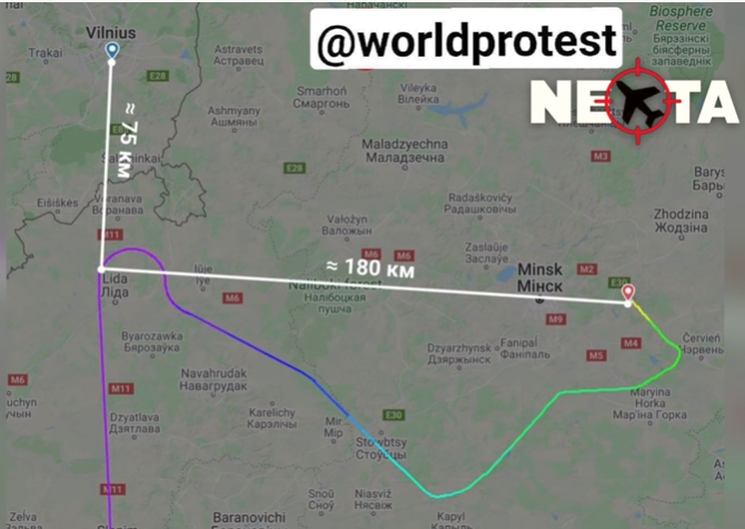Изменение курса. Вебсайт Flightradar124 зарегистрировал отклонение рейса FR4978 от намеченного маршрута незадолго до того, как самолет достиг литовской границы. Рейс развернуло на юго-восток в сторону Минска.