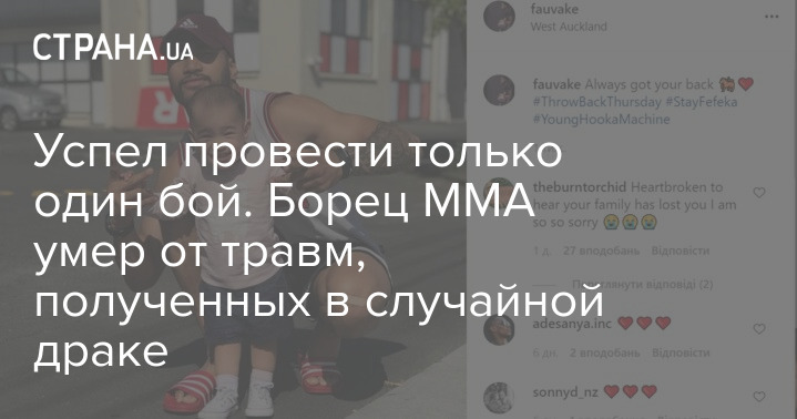 Боец смешанного стиля (MMA) 25-летний Фау Вэйк (Новая Зеландия) скончался в больнице от травм, которые он получил в уличной драке. Об этом сообщил представитель команды спортсмена в Instagram.