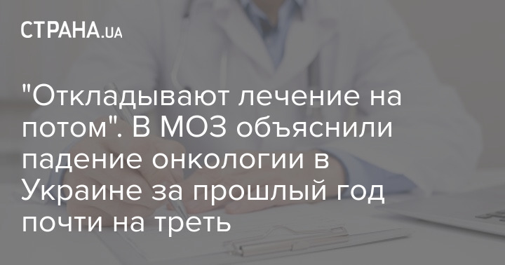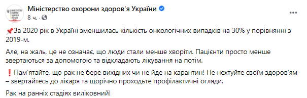 В 2020 году в Украине количество случаев онкологических заболеваний уменьшилось на 30% по сравнению с 2019-м. Медики предупреждают, что такие данные не свидетельствуют в пользу того, что украинцы стали реже болеть.