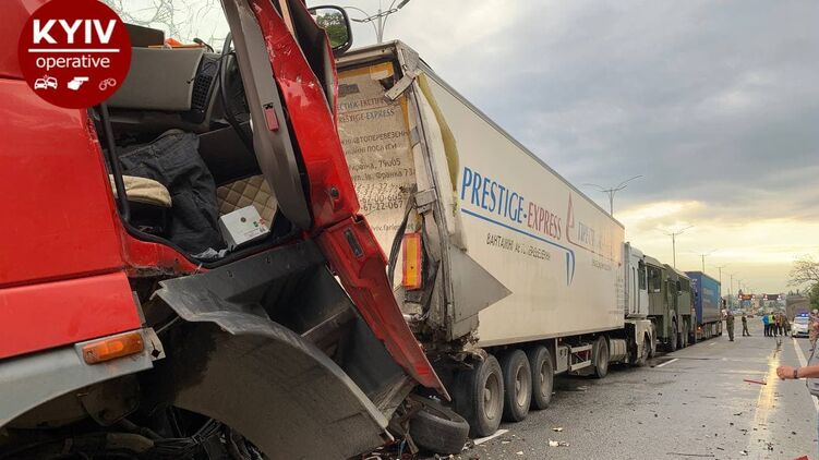 Сразу шесть грузовиков столкнулись у светофора на въезде в Киев по Бориспольской трассе. Как минимум два грузовика везли нацгвардейцев.