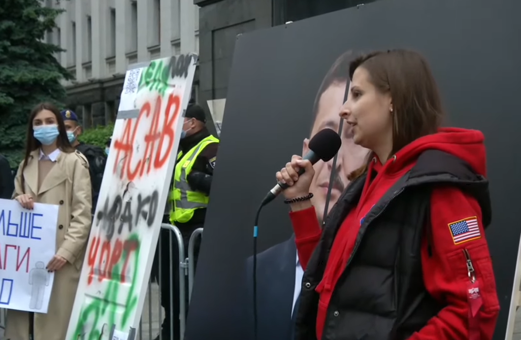 18:48 Еще одна активистка - Анна Гвоздяр - вышла к микрофону с американским флагом на рукаве. Она заявила, что уже восемь лет защищает Украину "от всякой русни".
