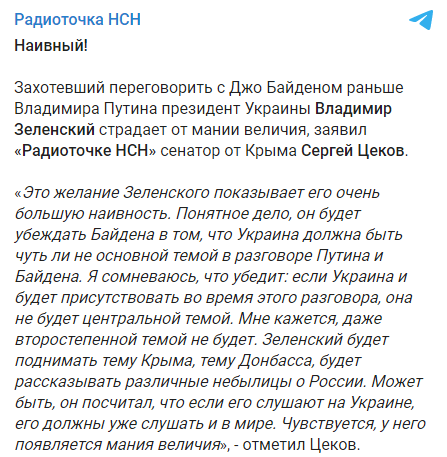 В пятницу, 28 мая, член комитета Совета Федерации РФ Сергей Цеков выразил свою критику по поводу желания президента Украины Владимира Зеленского поговорить с американским лидером Джо Байденом раньше, чем состоится его встреча с главой РФ Владимиром Путиным.