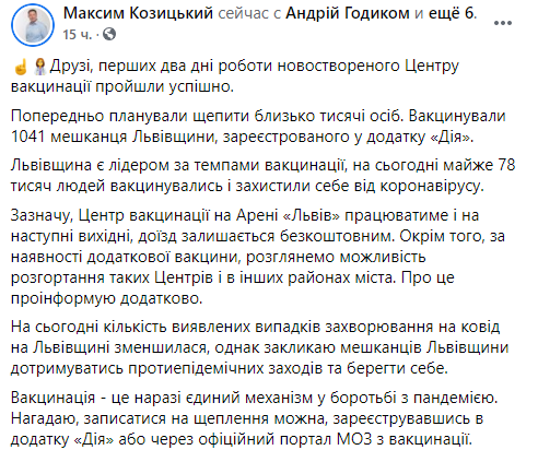 "Львовщина является лидером по темпам вакцинации, сегодня почти 78 тысяч человек вакцинировались и защитили себя от коронавируса", - написал Козицкий в Facebook.