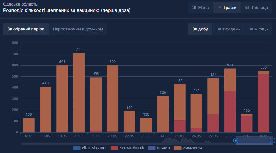 В Одесской области 29 и 30 мая вакцинировали 715 человек. В предыдущие выходные сделали 320 прививок.
