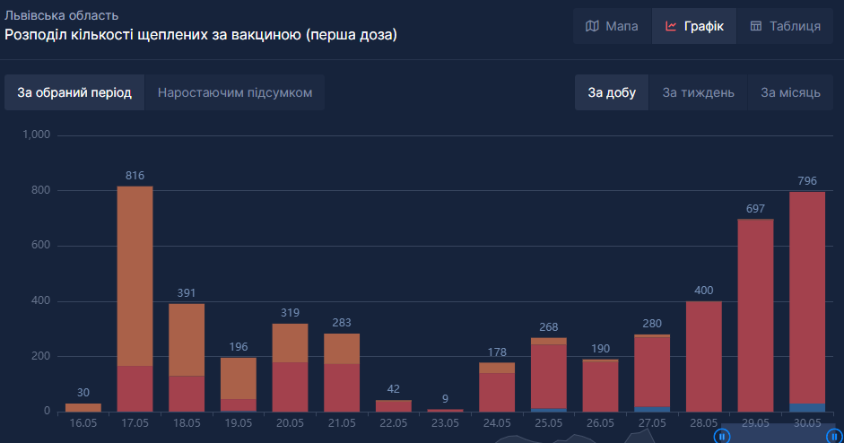 Во Львовcкой области 29 и 30 мая вакцинировали 1493 человека. На прошлых выходных - всего 51 вакцинация.