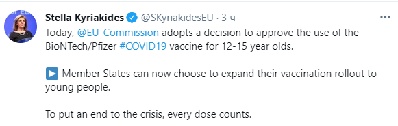 Об этом сообщила еврокомиссар по вопросам здравоохранения Стелла Кириакидес на своей странице в Twitter.