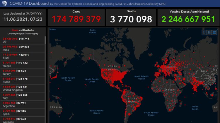 По данным на 11 июня, число зараженных ковидом на Земле приближается к 175 миллионам, фото: университет Дж. Хопкинса