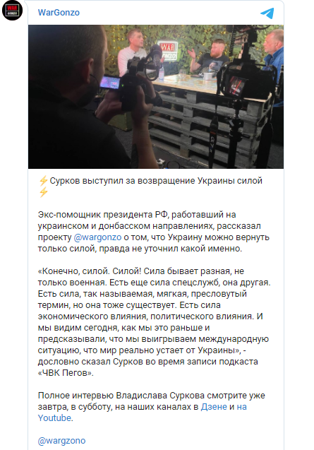 "Конечно, силой. Силой! Сила бывает разная, не только военная. Есть еще сила спецслужб, она другая. Есть сила, так называемая, мягкая, пресловутый термин, но она тоже существует. Есть сила экономического влияния, политического влияния", – сказал Сурков во время записи подкаста "ЧВК Пегов".