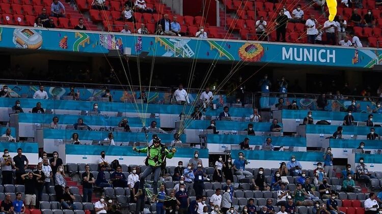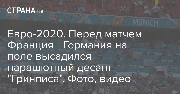 Перед матчем Евро-2020 в Мюнхене, где Франция сыграла с Германией, активист международной экологической организации "Гринпис" пролетел над болельщиками на парашюте и благополучно приземлился на поле.