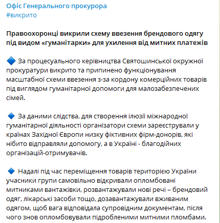"В дальнейшем при перемещении товаров по территории Украины участники группы самовольно открывали опломбированные таможенниками грузовики, разгружали новые вещи - брендовая одежда, лекарственные средства и т.п., догружали бывшей в употреблении одеждой, чтобы вес соответствовал сопроводительным документам, после чего вновь опломбировали поддельными таможенными пломбами", - рассказали в Генпрокуратуре.