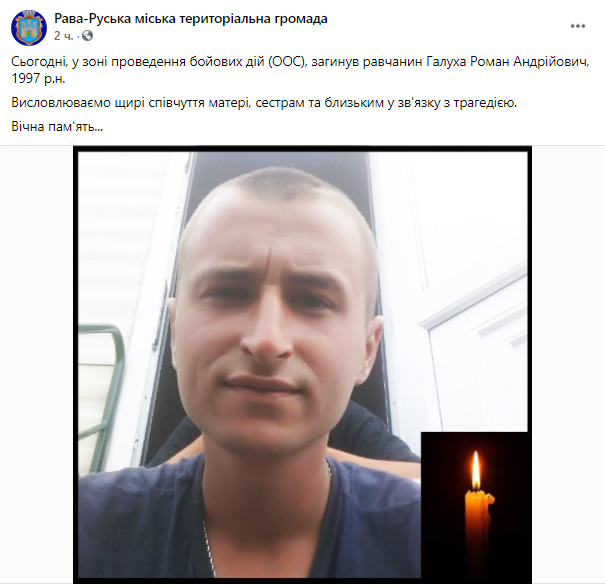 "Сегодня, в зоне проведения боевых действий (ООС), погиб равчанин Галуха Роман Андреевич, 1997 г.р. Выражаем искренние соболезнования матери, сестрам и близким в связи с трагедией", - говорится в сообщении в соцсети Facebook, опубликованном в среду, 16 июня.