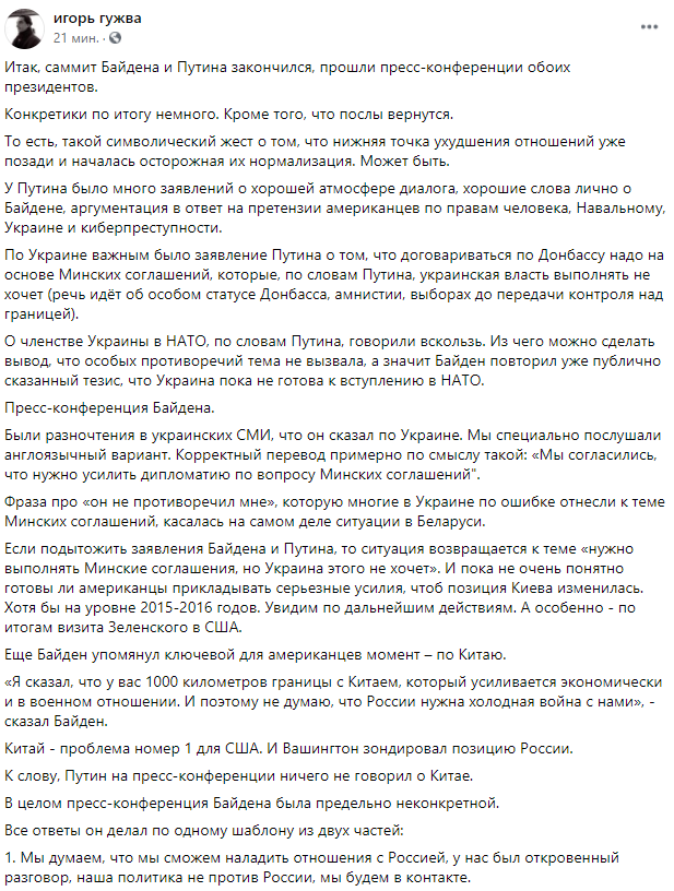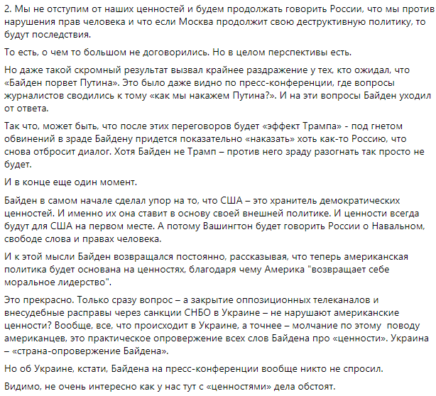 "Итак, саммит Байдена и Путина закончился, прошли пресс-конференции обоих президентов.