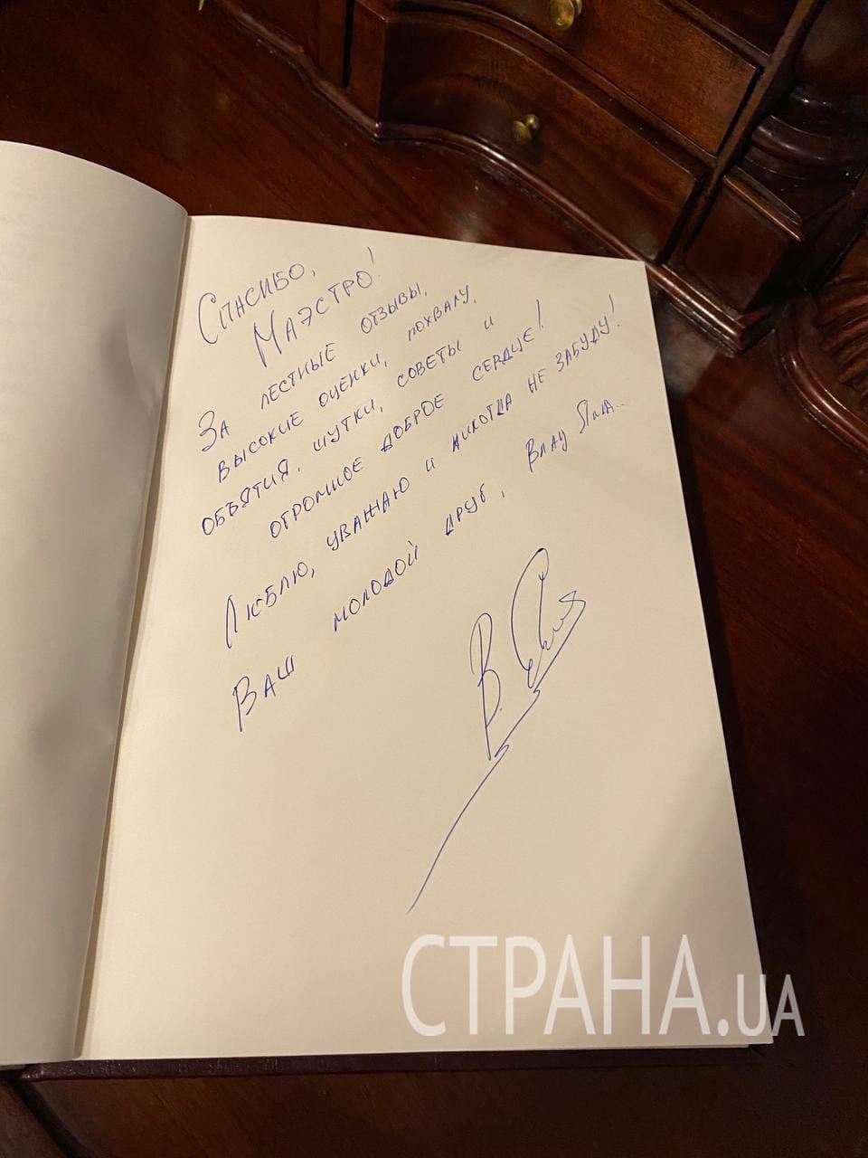 Свое послание в Книге оставил танцор Влад Яма. "Стране" стало известно, что Влад Яма написал о Чапкисе: "Спасибо, маэстро! За лестные отзывы, высокие оценки, похвалу, объятия, шутки, советы и огромное доброе сердце! Люблю, уважаю и никогда не забуду! Ваш молодой друг, Влад Яма"