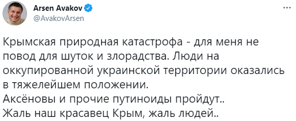 "Крымская природная катастрофа – для меня не повод для шуток и злорадства. Люди на оккупированной украинской территории оказались в тяжелейшем положении. Аксеновы и прочие путиноиды пройдут.. Жаль наш красавец Крым, жаль людей", – написал министр вчера вечером.