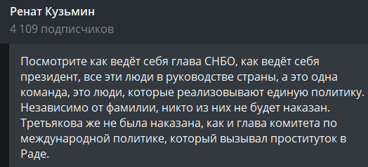 "Посмотрите как ведет себя глава СНБО, как ведет себя президент, все эти люди в руководстве страны, а это одна команда, это люди, которые реализовывают единую политику. Независимо от фамилии, никто из них не будет наказан. Третьякова же не была наказана, как и глава комитета по международной политике, который вызывал проституток в Раде", – написал он в Telegram.