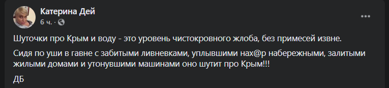 "На 100% была уверена, что найдется придурок, который таки свяжет потопы с тем, что в Крыму недостача пресной воды.