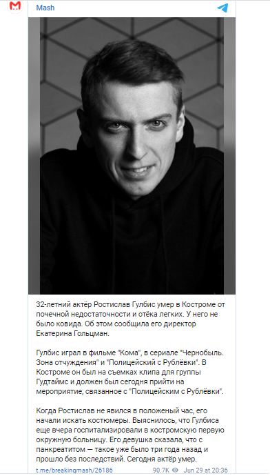 "Когда Ростислав не явился в положенный час, его начали искать костюмеры. Выяснилось, что Гулбиса еще вчера госпитализировали в костромскую первую окружную больницу. Его девушка сказала, что с панкреатитом - такое уже было три года назад и прошло без последствий. Сегодня актер умер", - сообщает телеграм-канал Mash.