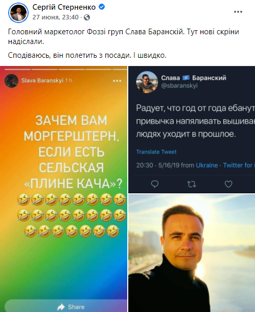 Поздно вечером 27 июня (когда Баста давал концерт уже в Одессе) на странице радикала Сергея Стерненко в Facebook появились некоторые скриншоты из сторис и Twitter Вячеслава Баранского и призыв к увольнению этого человека с работы.