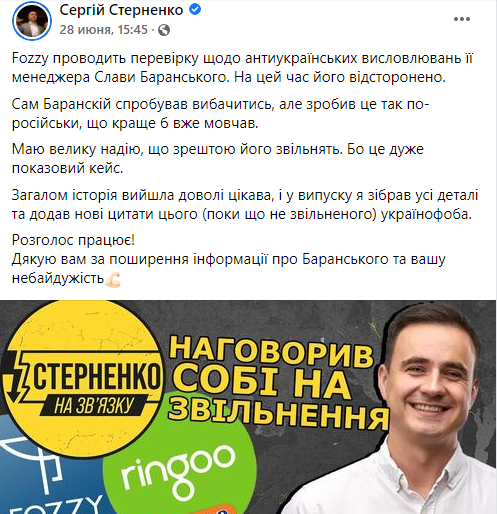 29 июня Fozzy Group официально заявила про "прекращение сотрудничества" с Вячеславом Баранским. Причиной назвали пресловутые публикации в соцсетях, "содержание и форму которых в компании не разделяют, и которые вызвали возмущение общества".