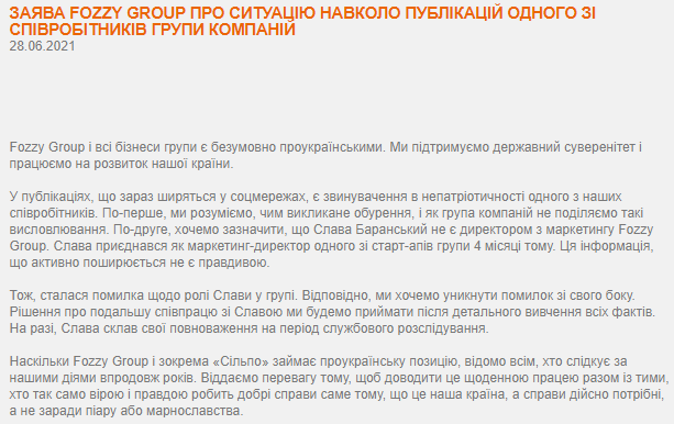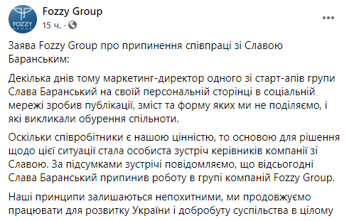 При этом уточнялось, что Баранский не является директором по маркетингу Fozzy Group, а присоединился к команде как маркетинг-директор одного из стартапов группы 4 месяца назад. Также заявили, что он сложил свои полномочия на период расследования.