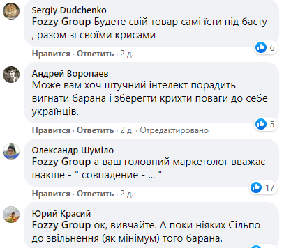 Комментариев с оскорблениями были сотни. Националисты писали о том, что Fozzy Group будут "свой товар сами есть под Басту, вместе со своими крысами", призывали последовать советам "искусственного интеллекта, чтобы уволить барана (так часто обзывали человека по аналогии с его фамилией - Баранский, Ред.)"