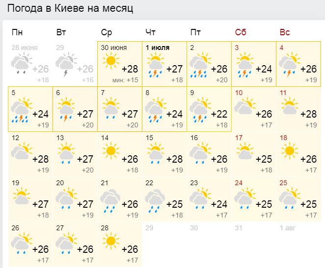 Прогноз погоды на июль 2021 в Киеве от Gismeteo