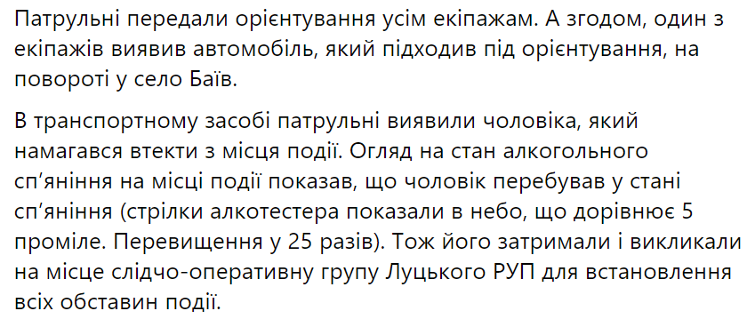 В транспортном средстве патрульные обнаружили мужчину, который пытался скрыться с места происшествия. Освидетельствование на состояние алкогольного опьянения на месте происшествия показало, что мужчина находился в состоянии опьянения (стрелки алкотестера показали в небо, равное 5 промилле. Превышение в 25 раз). Его задержали и вызвали на место следственно-оперативную группу Луцкого РУП для установления всех обстоятельств происшествия.