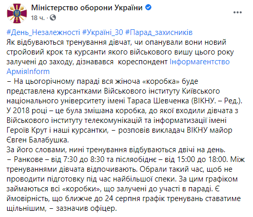 В пресс-службе ведомства отметили, что на нынешнем параде вся женская "коробка" будет представлена курсантками Военного института Киевского национального университета имени Тараса Шевченко.