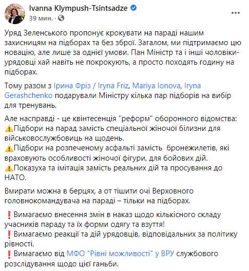 "Провести военный парад к 30-летию нашей независимости, где военные женщины должны шагать на каблуках. Этот свирепый трэш, простите, мы увидели на сайте Министерства обороны... Считайте это нашим открытым обращением провести служебное расследование и доложить обществу, кто принял такое решение, отчитаться, сколько средств было потрачено на закупку этой обуви из наших налогов и кто понесет материальную ответственность за это. Публично извиниться за такое унижение женщин перед своей армией и ветеранками, которые с оружием в руках продолжают защищать независимость и суверенитет нашей страны", - заявила Кондратюк с трибуны Верховной Рады.