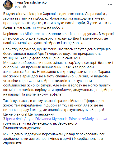 "Существует приказ, в котором указаны образцы военной формы для женщин, там предусмотрены каблуки летом и зимой. Но это не вопрос парада и плаца, где мужчины пойдут в берцах! Это не равенство! Это унижение!" - пишет Геращенко.