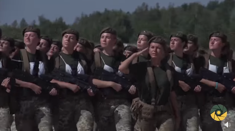 120 курсанток военного института Киевского национального университета им. Шевченко, среди которых трое воевали на Донбассе, прошли строевым шагом по Крещатику.