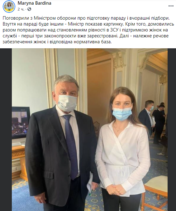 "Поговорили с министром обороны о подготовке парада и вчерашних каблуках. Обувь на параде будет другой - министр показал картинку. Кроме того, договорились вместе поработать над становлением равенства в ВСУ и поддержкой женщин на службе", - написала нардеп.