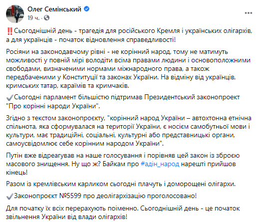 "Сегодняшний день - трагедия для российского Кремля и украинских олигархов, а для украинского - начало восстановления справедливости! Россияне на законодательном уровне - не коренной народ, поэтому не смогут в полной мере владеть всеми правами человека и основными свободами, определенными нормами международного права, а также предусмотренными в Конституции и законах Украины. В отличие от украинских, крымских татар, караимов и крымчаков", - считает Семинский.