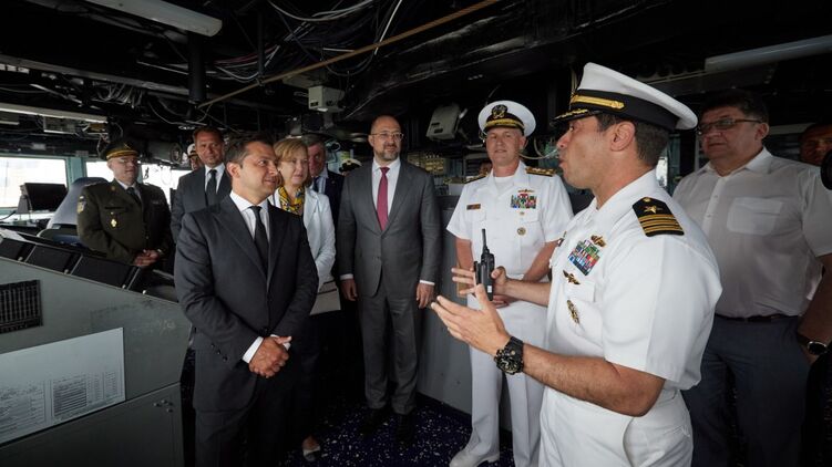 Президент Украины Владимир Зеленский во время визита в Одессу 4 июля побывал на борту эсминца USS Ross, который принимает участие в военно-морских учения Sea Breeze-2021.