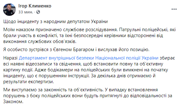 "Моим приказом назначено служебное расследование. Патрульные полицейские, участвовавшие в конфликте, и их непосредственные руководители отстранены от выполнения служебных обязанностей. Я лично встретился с Евгением Брагарь и выслушал его позицию", - написал глава Нацполиции в Facebook.