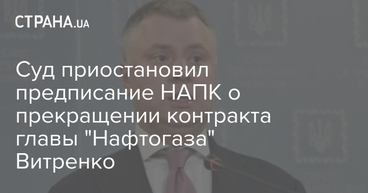 Окружной админсуд Киева приостановил действие предписания Национального агентства по предупреждению коррупции (НАПК) от 1 июля в адрес наблюдательного совета НАК "Нафтогаз Украины" о прекращении контракта с главой правления компании Юрием Витренко.  Решение суд принял в понедельник, 5 июля, и таким образом удовлетворил иска Юрия Витренко об отмене предписания НАПК.