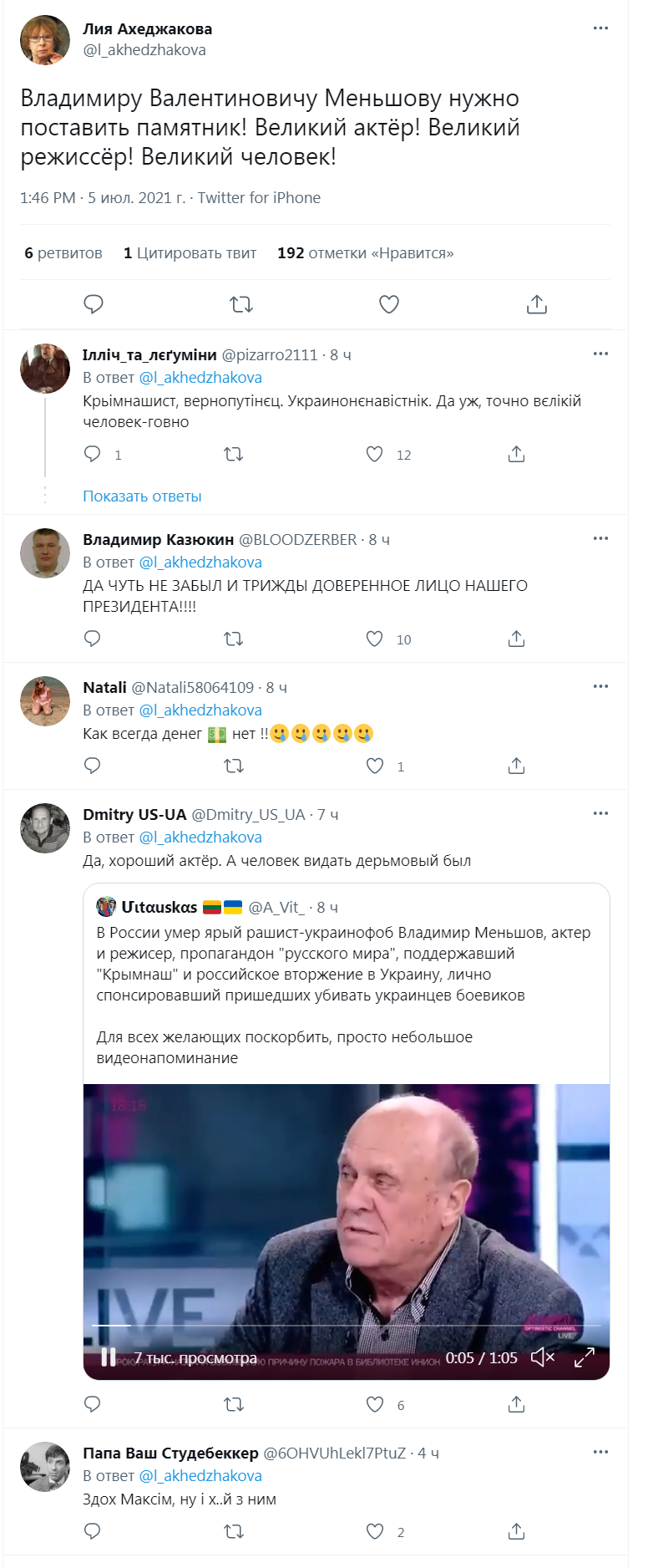 "Комменты с проклятиями в адрес Владимира Меньшова написали те, кого Лия Ахеджакова так любит и защищает. Получайте, Лия. Может, прозреете?" - гласит один из них.