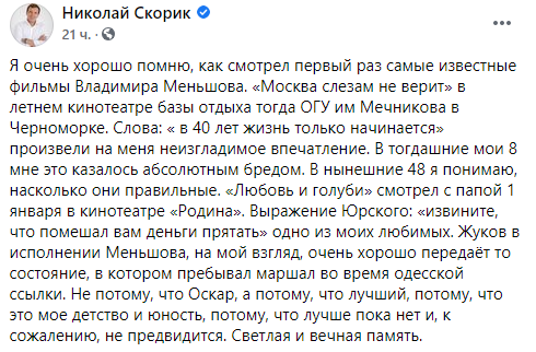 "Я очень хорошо помню, как смотрел первый раз самые известные фильмы Владимира Меньшова. "Москва слезам не верит" в летнем кинотеатре базы отдыха тогда ОГУ им. Мечникова в Черноморке. Слова: "В 40 лет жизнь только начинается" произвели на меня неизгладимое впечатление. В тогдашние мои 8 мне это казалось абсолютным бредом. В нынешние 48 я понимаю, насколько они правильные. "Любовь и голуби" смотрел с папой 1 января в кинотеатре "Родина". Выражение Юрского: "Извините, что помешал вам деньги прятать" одно из моих любимых. Жуков в исполнении Меньшова, на мой взгляд, очень хорошо передаёт то состояние, в котором пребывал маршал во время одесской ссылки. Не потому, что Оскар, а потому, что лучший, потому, что это мое детство и юность, потому, что лучше пока нет и, к сожалению, не предвидится. Светлая и вечная память", - написал Скорик.