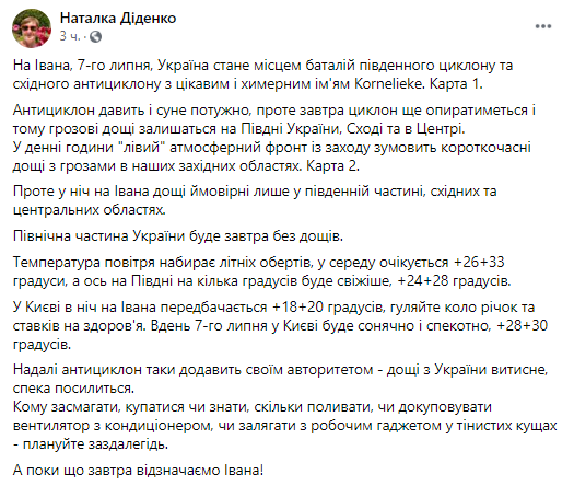 В среду, 7 июля, на Ивана Купала Украина станет местом баталий южного циклона и восточного антициклона с необычным именем Kornelieke. Об этом сообщила в соцсети синоптик Наталья Диденко.